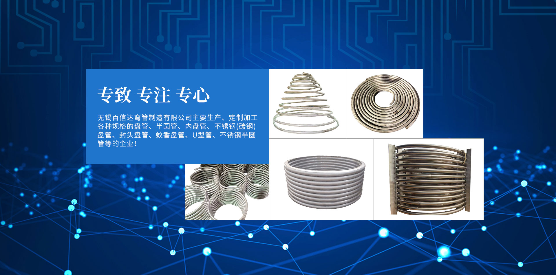 無錫百信達(dá)彎管制造有限公司位于經(jīng)濟(jì)發(fā)達(dá)、風(fēng)景秀麗的太湖之濱。本公司擁有完整、科學(xué)的質(zhì)量管理體系,公司的誠(chéng)信、實(shí)力和產(chǎn)品質(zhì)量獲得業(yè)界的認(rèn)可。公司專注生產(chǎn)、定制加工各種規(guī)格的盤管、半圓管、內(nèi)盤管、不銹鋼盤管、封頭盤管、蚊香盤管、U型管、不銹鋼半圓管、碳鋼盤管等的企業(yè)。本公司設(shè)計(jì)加工的彎管設(shè)備,質(zhì)量精良、結(jié)構(gòu)合理,效率高、操作簡(jiǎn)易、經(jīng)久耐用。公司已經(jīng)承接了各地多個(gè)大型場(chǎng)館工程項(xiàng)目的彎管加工,屢次得到了多家大客戶的好評(píng)。努力滿足客戶的需要,不斷提高自身水平是公司追求的目標(biāo)。歡迎社會(huì)各界朋友蒞臨無錫百信達(dá)彎管制造有限公司參觀、指導(dǎo)和業(yè)務(wù)洽談!